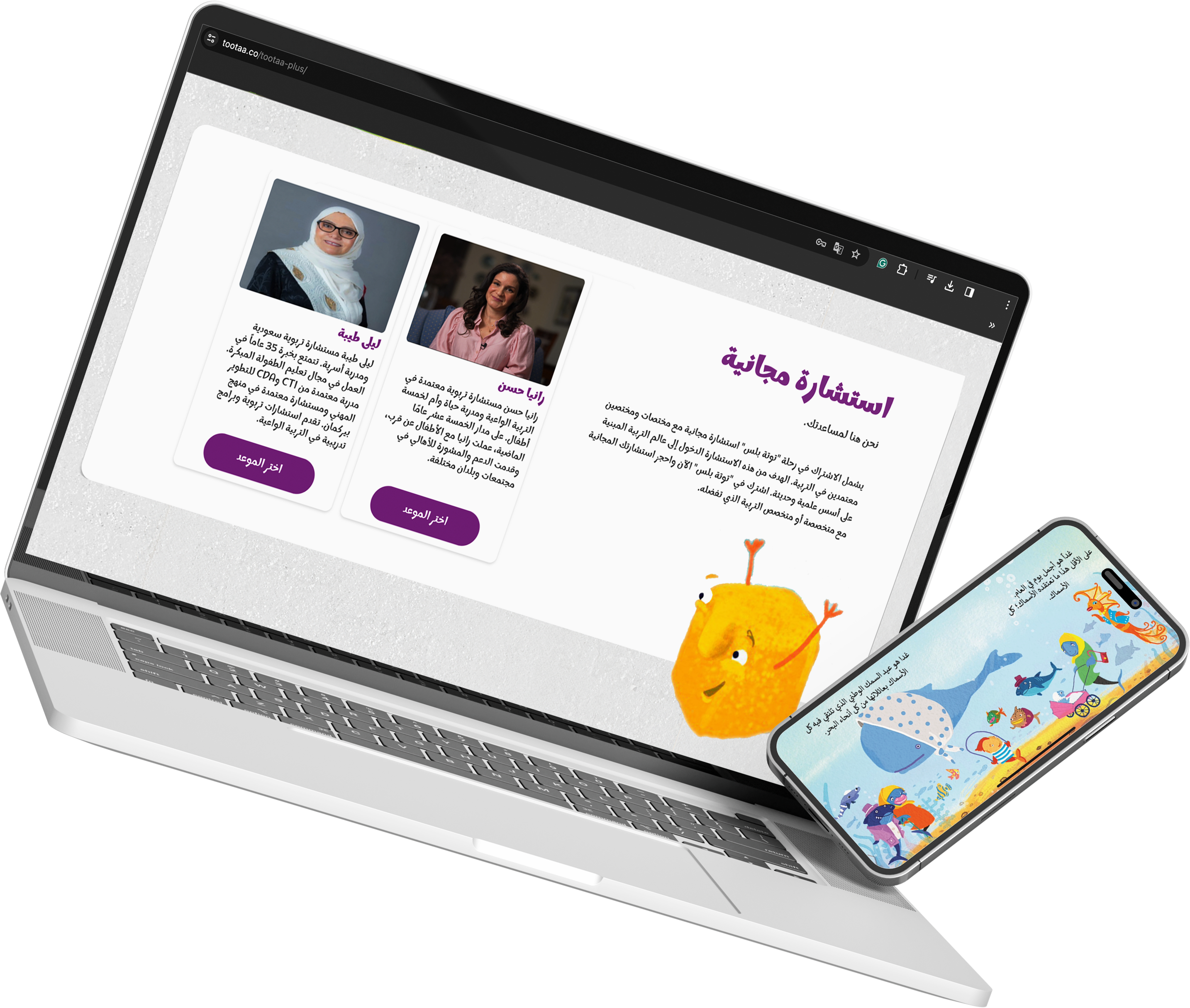 يشمل الاشتراك في رحلة “توتة بلس” استشارة مجانية مع مختصات ومختصين معتمدين في التربية. الهدف من هذه الاستشارة الدخول إلى عالم التربية المبنية على أسس علمية وحديثة. اشترك في “توتة بلس” الآن واحجز استشارتك المجانية مع متخصصة أو متخصص التربية الذي تفضله.